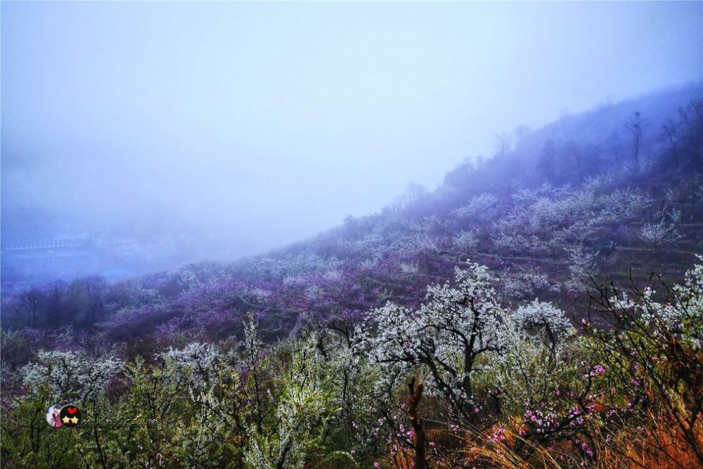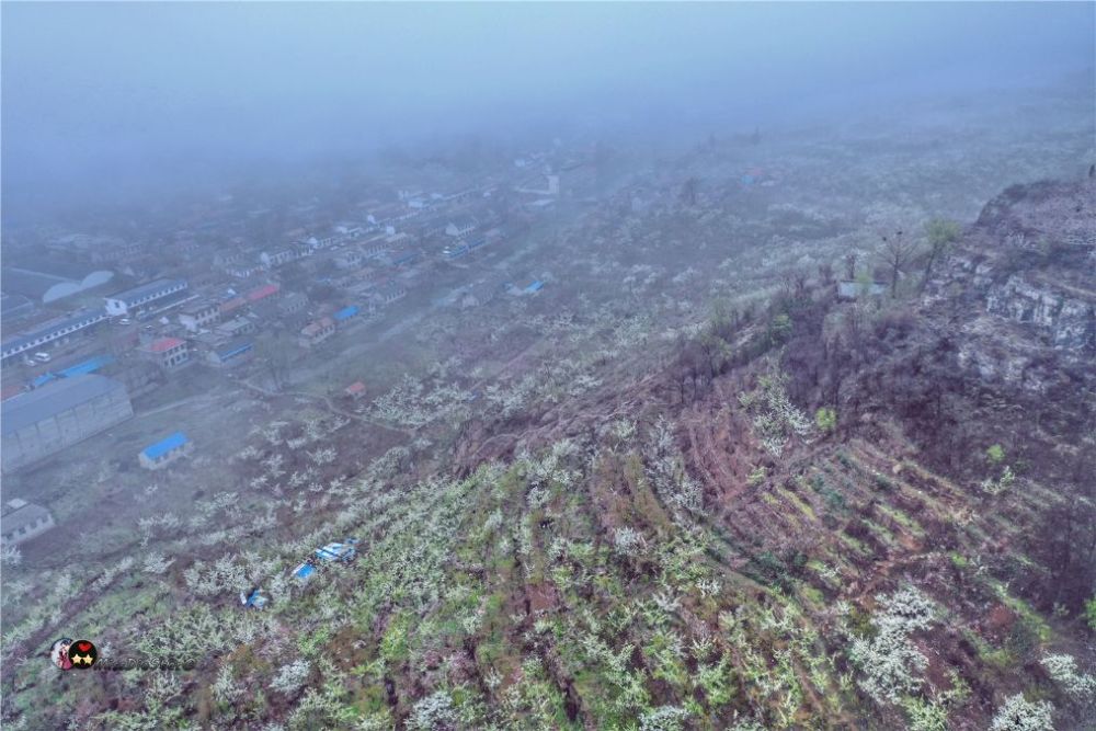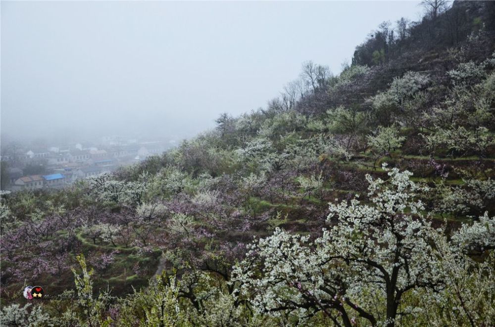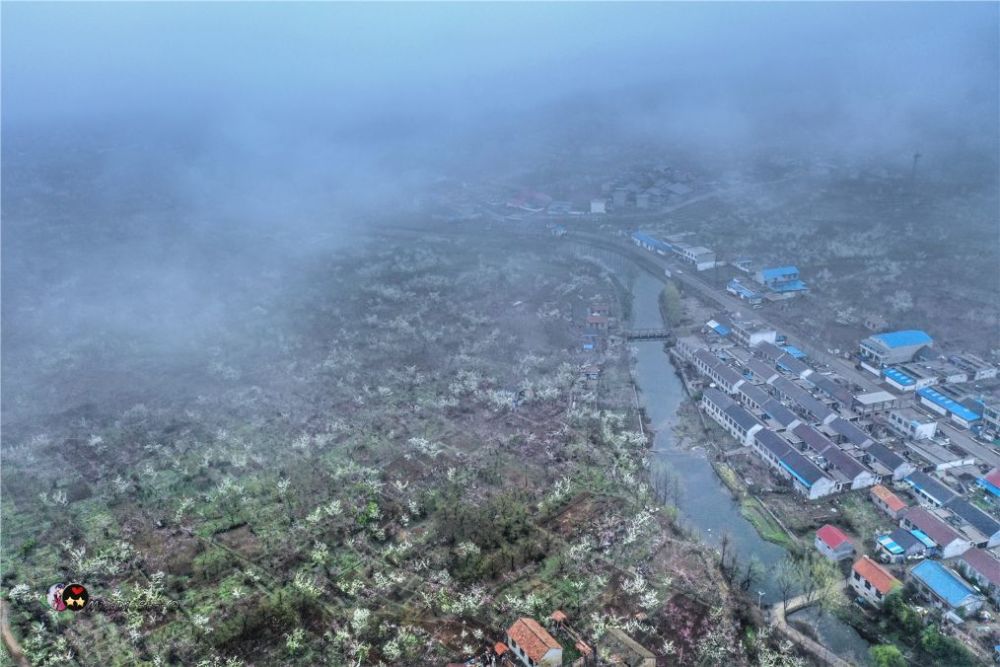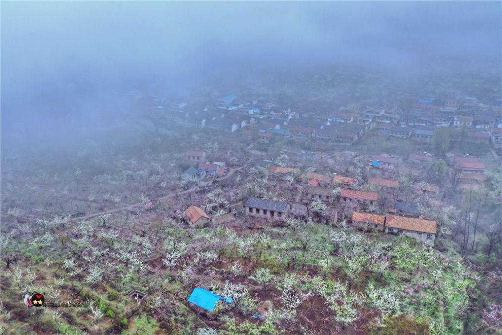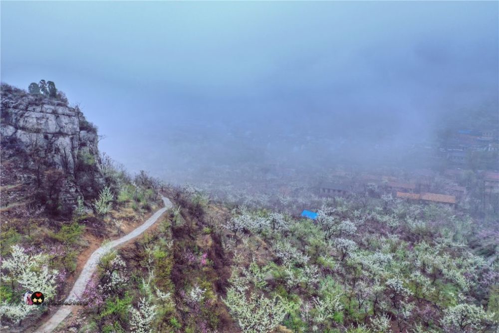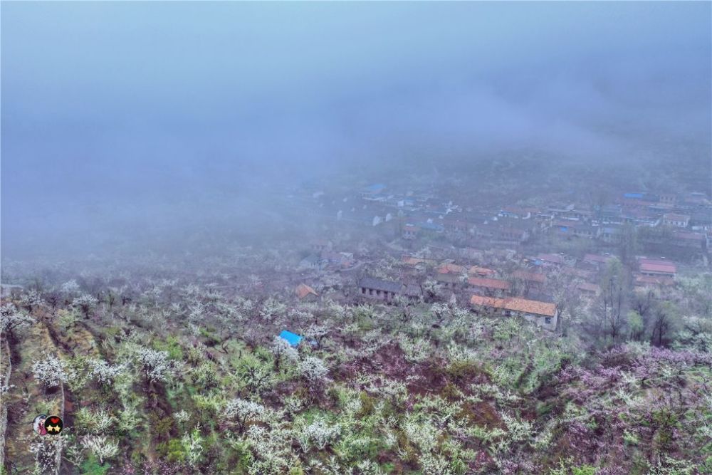 登上山坡,很清晰的看到这片乡村花海,云雾缭绕,宛如仙境。远处有条河流,将村居和果树分开,民居朴素而统一,盛开花儿的果树点缀山坡。