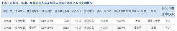 昨日,深交所官网数据显示,格力电器董事黄辉和副总裁谭建明在前日双双买入自家公司股票,黄辉购入5000股,成交均价为44.88元。格力电器2017年年报显示,黄辉为公司董事、常务副总裁、总工程师,此次增持后,黄辉对格力电器持股达到738万股。虽然格力电器股价在1月底创出阶段新高后,走出一波下行行情,但在今年一季度,格力电器依然获得了机构的增持,格力电器董事长董明珠还被挤出了前十大股东的行列。2017年年报显示,格力电器第一大股东为珠海格力集团有限公司,持股比例18.22%。