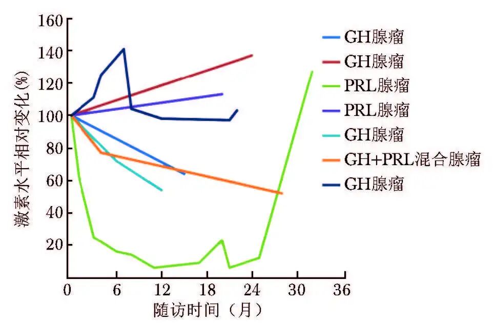 本研究7例功能性垂体巨大腺瘤患者中,仅1例垂体生长激素细胞腺瘤患者达到生化指标(IGF-1)的CR,3例患者未出现激素水平下降。