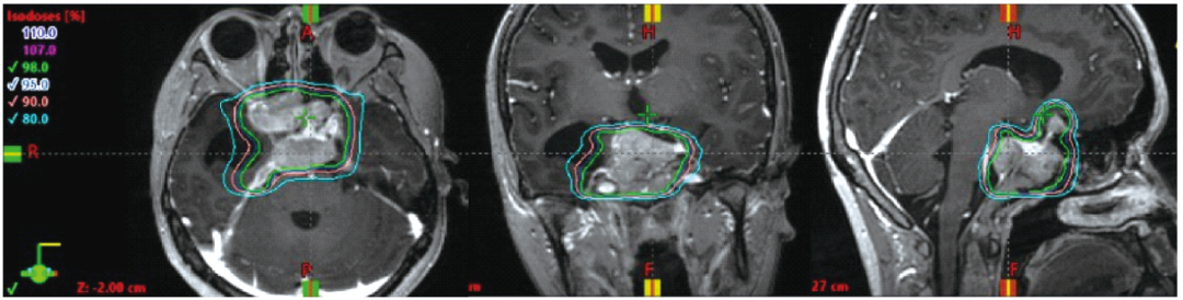 绿色为98%等剂量曲线,与肿瘤形状高度适形,高剂量区避让了后方脑干及两侧颞叶