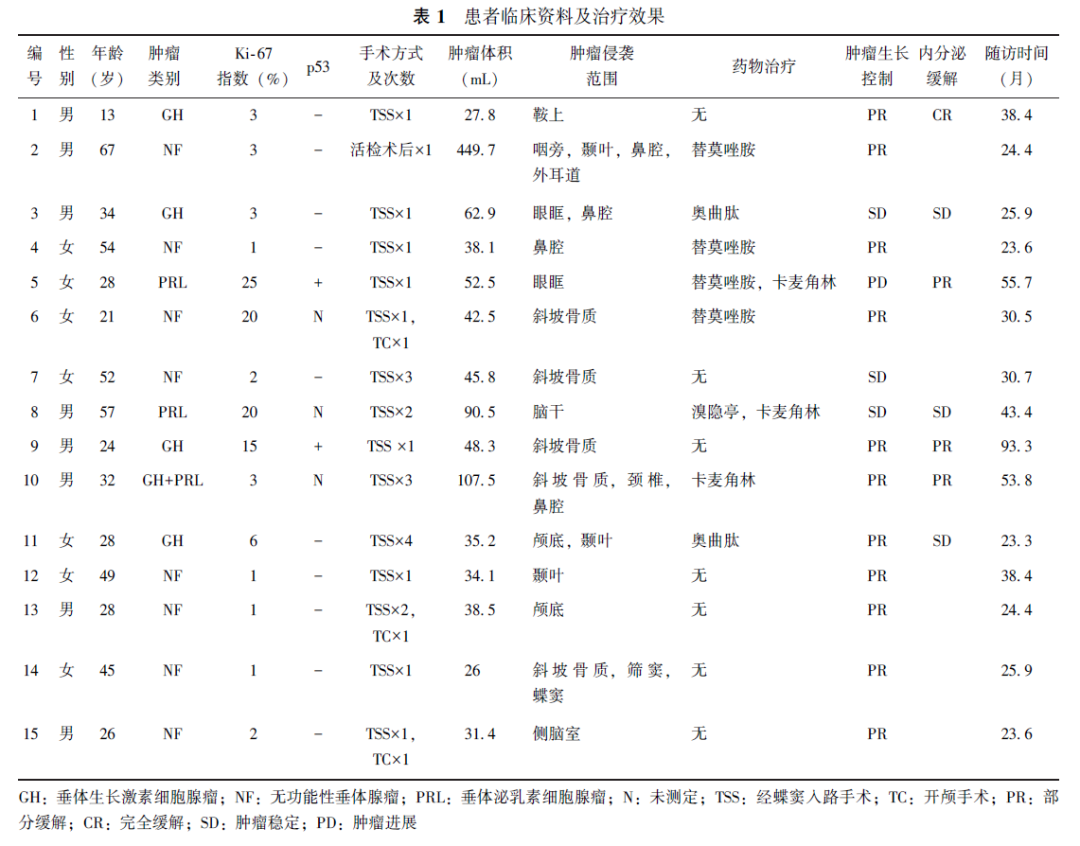 共15例符合纳入和排除标准的患者入选本研究。其中,男性8例,女性7例;中位年龄32岁;无功能性腺瘤8例,垂体生长激素细胞腺瘤4例,垂体泌乳素细胞腺瘤2例,垂体生长激素及泌乳素细胞混合腺瘤1例。