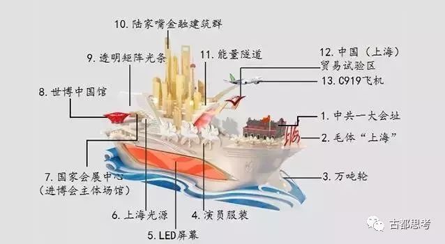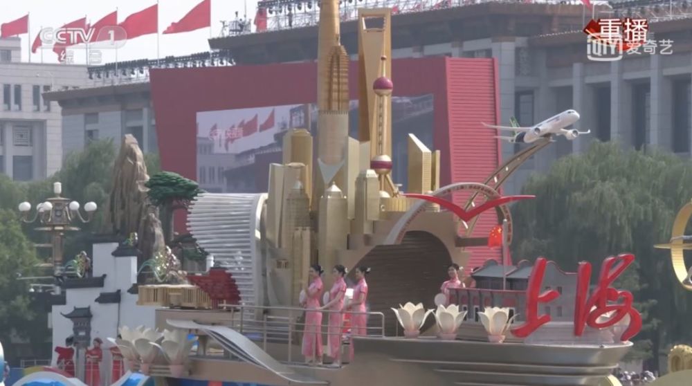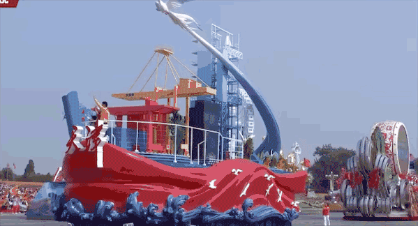 彩车一侧是C919大飞机造型,它的生产商——中国商飞坐落在上海浦东。应该说,飞机造型最能体现上海现代制造业的发展成就。一侧是轮船造型,上海正在推进包括航运中心在内的“五个中心”建设,应该说,轮船造型也符合上海的城市特征。