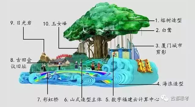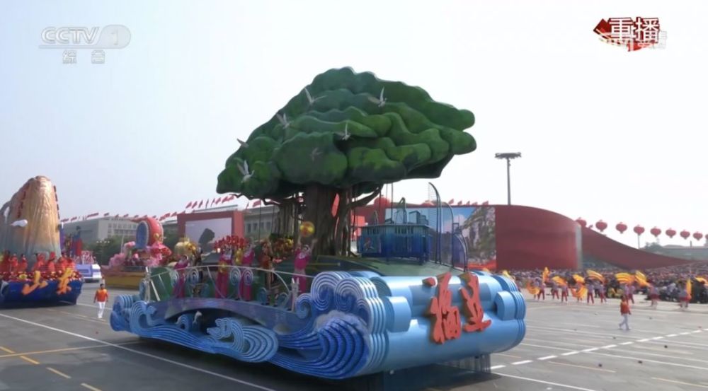 彩车上一棵宏大挺拔的榕树生机勃勃、枝繁叶茂根深,代表福建扎实践行习近平生态文明思想,建设全国生态文明试验区的丰硕成果;鲜艳的红字“古田会议永放光芒” 代表福建弘扬红色文化,传承红色基因,加快革命老区苏区发展,凸显中国特色社会主义事业不断从胜利走向胜利;明快的蓝色海洋波浪代表福建是全国海上丝绸之路核心区,展现进一步扩大开放、建设海洋强省,推进海上丝绸之路核心区建设的成效;数字中国标识和现代城市风貌剪影代表福建高质量发展,加快推进数字经济发展的“高素质”;彩车是一座流动舞台,以流线型的海浪架起一座跨越海峡的彩虹桥,利用声光电等现代科技手段演示两岸通水、通电、通桥以及心灵相通的“两岸一家亲”理念和福建探索两岸融合发展新路的成果与风采。