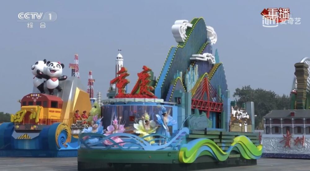 彩车中丰富的重庆元素,也领略到了独特的山城魅力。高达8.8米的彩车,上半部分是连绵的群山,中间是重庆地标性的建筑,车体底座两边则是象征长江和嘉陵江的两江水波浪造型,充分体现了山在城中、城在山中、两江环抱的城市特色。