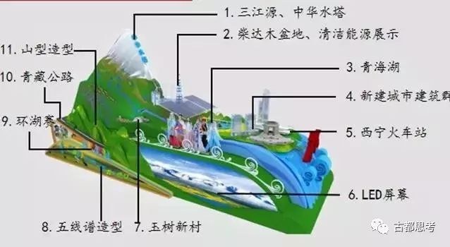 ★三江源中华水塔。车体后部为大体量的山体造型。山体正面雪线下为“中华水塔”四个字,凸显青海重要生态地位;山体主视觉画面表现为雪山、水系、湖泊、雪豹、藏羚羊、野牦牛以及黄河、长江、澜沧江等的自然生态造型;山体背部主要是星罗棋布的湖泊、水系和牛群、羊群等人居和谐造型;山体后部为大面积的森林造型。主山体两侧还设计了实际充当挡板作用的绿色山体和丹霞山体造型,以增强山势的群山起伏和多样性。