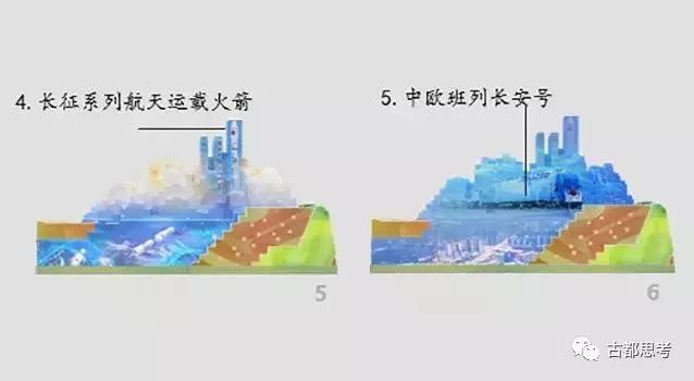 元素二:中欧班列一蓉欧快铁、新能源页岩气开发、核电技术华龙一号、电子信息墙。表达党的十八大以来具有四川特色的支柱产业和现代高科技发展,反映四川“一带一路”建设新成果和四川经济发展、科技进步、军民融合的辉煌成就。