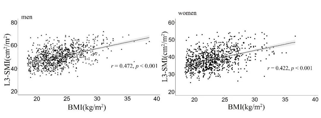 如图4所示,L3-SMI与BMI呈线性正相关,男性的相关性(r=0.472,p<0.001)高于女性(r=0.422,p<0.001)。