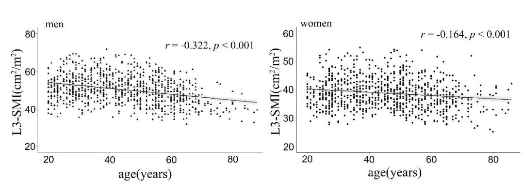 图3 散点图描述不同性别L3-SMI与年龄之间的相关性