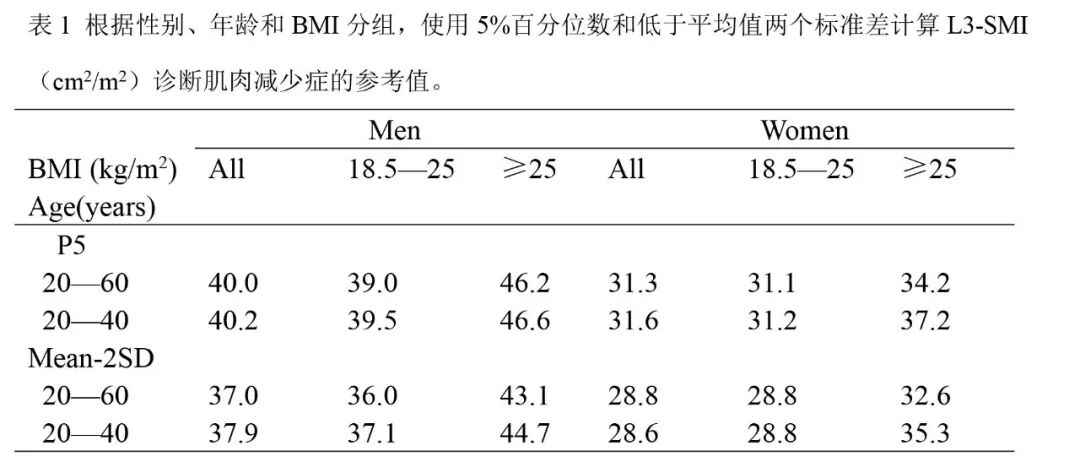 在20-59岁人群中,使用第5百分位数诊断肌肉减少症,L3-SMI的参考值是男性40.0 cm2/m2,女性31.3 cm2/m2。使用低于平均值两个标准差诊断低肌肉质量,L3-SMI的参考值是男性37.0 cm2/m2,女性28.8 cm2/m2。