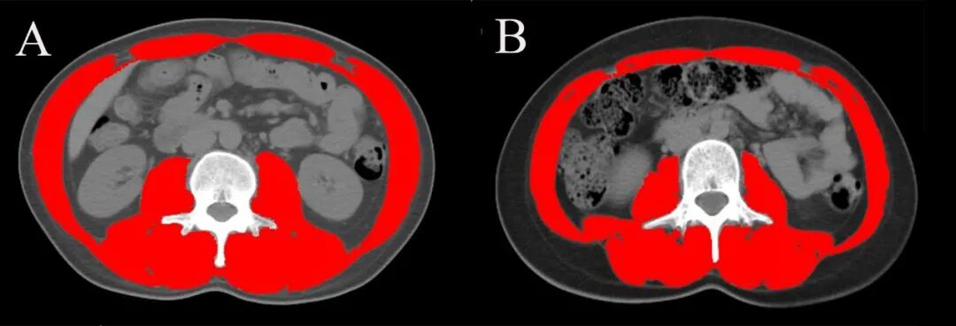 图2 在(A)26岁,BMI 21.6 kg/m2男性和(B)20岁,BMI为20.9 kg/m2女性第三腰椎(L3)腹部CT扫描图片