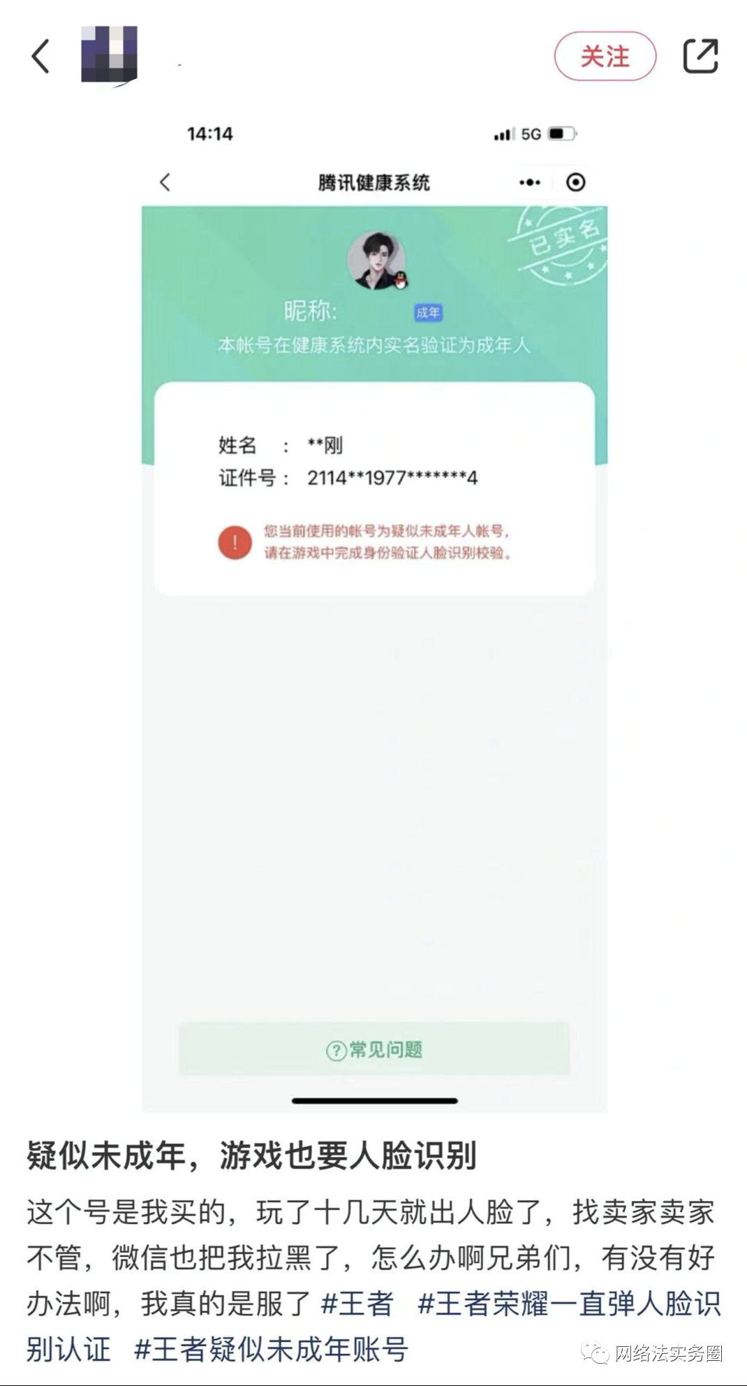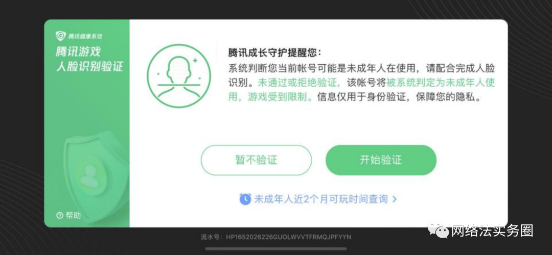 来源:腾讯游戏中弹出的人脸识别要求而网络游戏或者直播平台是否需要做到如此程度,目前立法并未明确要求,但根据上述我们参考的司法实践,法院普遍认为,即使游戏或直播平台对账号进行了基于手机号码、真实姓名及身份证号码的真实身份验证,一旦涉及未成年人充值退款纠纷,上述验证方式仍会被法院认定为“未采取充足的技术措施”防止未成年人进行注册及充值消费,是否预示着以后网络游戏及网络直播平台在用户充值、打赏前也要进行必要的身份验证?现阶段只能期待以后的立法及监管、司法机关给出具体的答案。