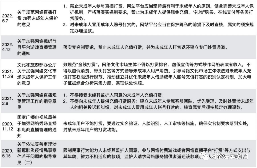 但《国家广播电视总局关于加强网络秀场直播和电商直播管理的通知》规定,网络秀场直播平台要对网络主播和“打赏”用户实行实名制管理。未实名制注册的用户不能打赏,未成年用户不能打赏。要通过实名验证、人脸识别、人工审核等措施,确保实名制要求落到实处,封禁未成年用户的打赏功能。