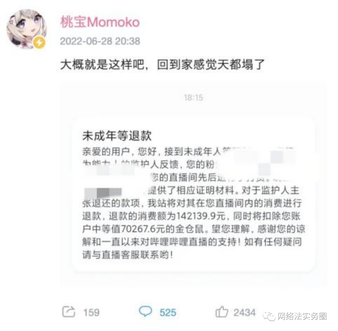 后话俗话说,上有政策下有对策,如果未成年人执意想要打赏主播或者在游戏中充值消费,凭借互联网的发达与信息的更新速度,未成年人总能有办法绕过平台设置的重重障碍,来达到自己的目的,此时仅靠直播平台、游戏厂商利用技术措施为产品层层加码,甚至妨碍到正常成年用户的使用时,谁又能来为平台、游戏厂商、主播和普通用户等人群的损失买单?此外,《民法典》第二十六条规定:“父母对未成年子女负有抚养、教育和保护的义务。”父母对未成年人子女进行教育,是法律规定的义务与责任,而如今该项义务放置于互联网世界中,在平台做了多重认证与防护措施的情况下,若仍一味地将未成年人的教育和监管责任转嫁给互联网企业承担则有失偏颇。未成年人保护机制是国家、社会和企业为了保护未成人的健康成长而共同建立并为之努力的,未成年人的父母等监护人也应当履行监护职责,该机制绝不能成为监护人责任缺位的“免死金牌”,也不能成为居心叵测之人及黑灰产业链从事违法犯罪活动的“避风港”,只有家长及未成人共同承担起一定的责任,加强对未成年人使用网络行为的引导和监督,才能有效防范未成年人网络沉迷问题,为未成年人营造安全、健康的网络环境。①北京互联网法院(2020)京0491民初7976号一审民事判决书。