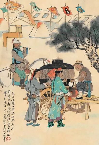 用车载酒在街市卖,唐代已有之。杜甫《饮中八仙歌》:『汝阳三斗始朝天,道逢车口流涎;恨不移封向酒泉。』这种车就是运酒或卖酒的车。宋代挑酒桶卖酒,见于《水浒传》中。清代烧锅造酒,多用大型容器贮存;如用高丽纸裱糊大竹篓,涂以猪血,一般为酒篓;可容酒百斤以上者,名为酒海。以车载酒海售酒,多在人数众多场所,如庙会、围场等处。承德离宫藏有清代『长白山老满洲京旗驻防热河兴隆阿』所绘之《围场风俗图》,其中即有大车载酒海售酒之情形。