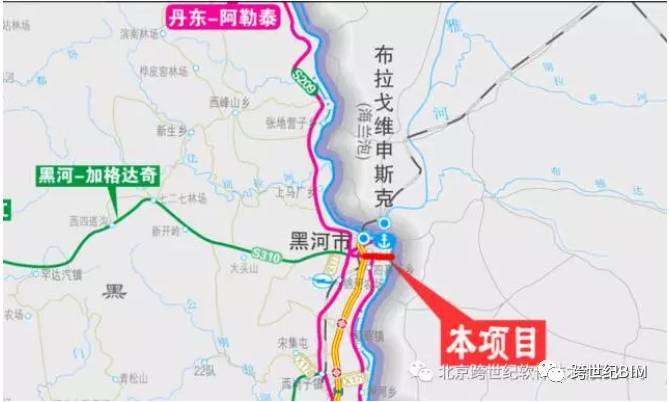 黑河—布拉戈维申斯克黑龙江(阿穆尔河)大桥是中俄界河黑龙江上首座现代化公路大桥,1988年7月,中俄两国开始动议黑河—布拉戈维申斯克黑龙江(阿穆尔河)大桥项目,至今已历时28年。2015年9月3日,在中俄两国元首的见证下,双方交通部门代表两国政府签署了大桥建设的《补充议定书》。该桥于2016年11月份开工建设,起点位于中国黑龙江省黑河市长发屯,终点位于俄罗斯阿穆尔州布拉戈维申斯克市卡尼库尔干村,路线全长19.9公里,中方境内长6.5公里,俄方境内长13.4公里,建设标准为二级公路。