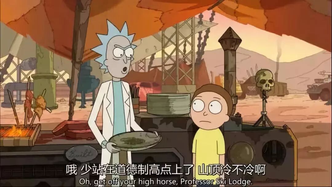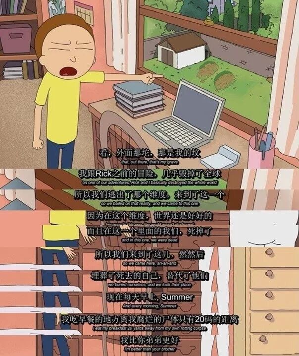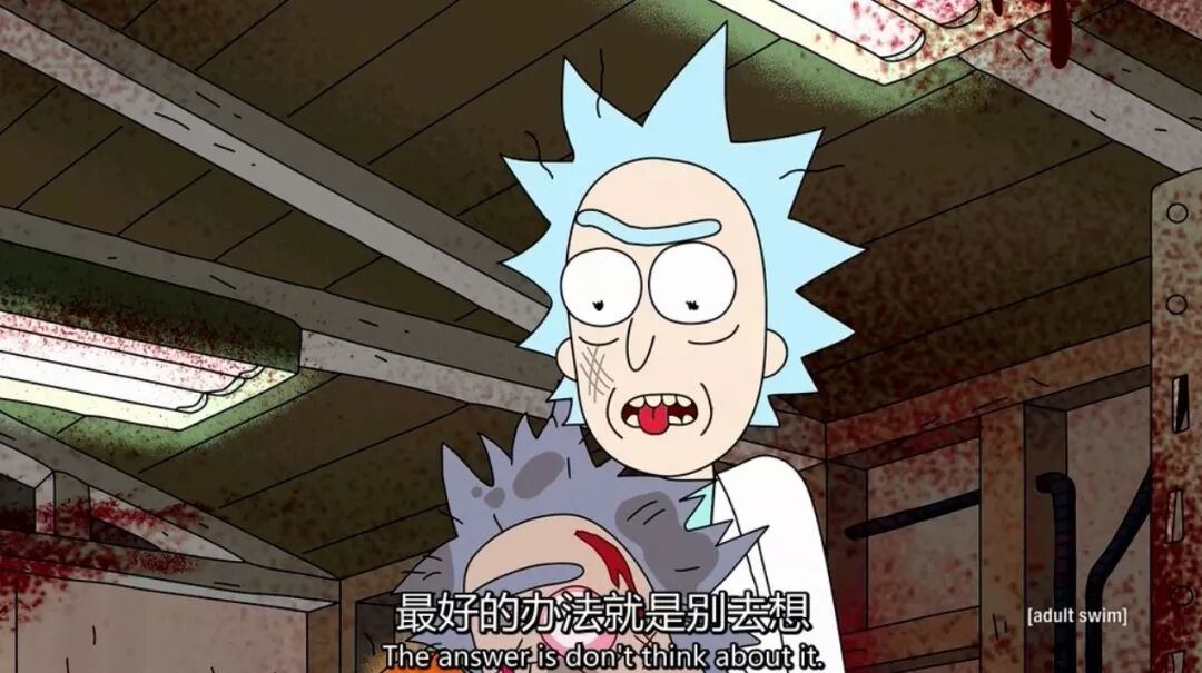 莫蒂问姥爷:“What about the reality where Hitler cured his cancer, Rick?”Rick抱着另一个平行宇宙自己的尸体说道:“The answer is don't think about it.”