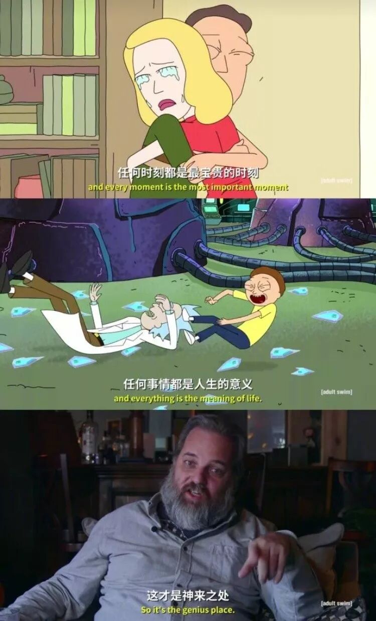 主创之一Dan Harmon解读过这个有关生命意义的故事:“我不赞同 那种死亡了,就了无意义。地球会挂掉,太阳会爆炸,宇宙在变冷,到最后什么都无所谓。你越能抽身,你就能承受越多的事实。但当你聚焦于地球,聚焦于一个家庭。聚焦于一个人的大脑,聚焦于一段童年或者是一段经历。你看到的是,一切都很重要。我们常有机会去短暂体验各种幻觉...比如我爱我的女朋友,我爱我的狗狗。这不是更好吗?认识到什么都无所谓这个事实。其实能够把你从那些糟糕的时刻拯救出来。一旦挺过那些可怕事实并且接受它,那任何地方都是宇宙中心,任何时刻都是最宝贵的时刻,任何事情都是人生的意义。这才是神来之处。”