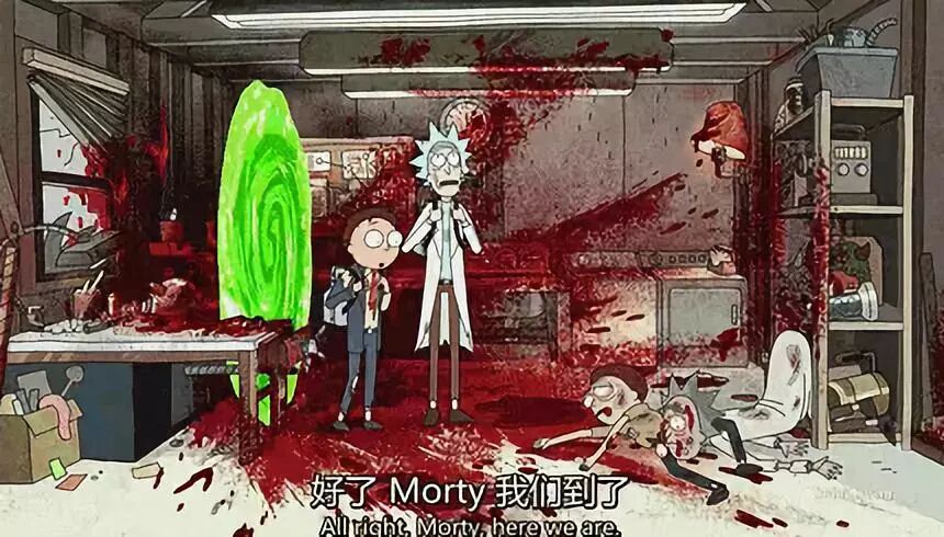 在这里,他们发现这个时空的祖孙二人刚死于一场实验意外,俩人都被炸得稀巴烂。于是瑞克带着外孙莫蒂,亲手把“自己”的尸体埋在了后院。