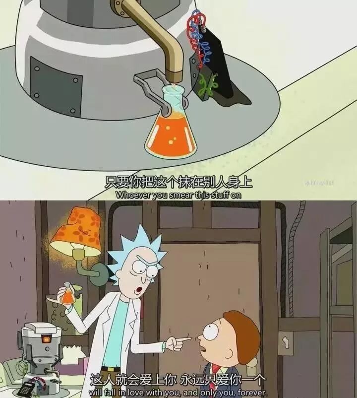 就是这么一部无厘头、大尺度、脑洞大开的“动画片”,让一群成年人,甘愿跪倒在丑陋、暴躁的姥爷Rick面前大呼神作。刚开始看的时候,你肯定觉得这部片子,“脑子不正常”。第一季里有个故事,作为青春期男孩,Morty爱上了同学Jessica。宇宙最强大脑的姥爷强力助攻,给了他一瓶药水。