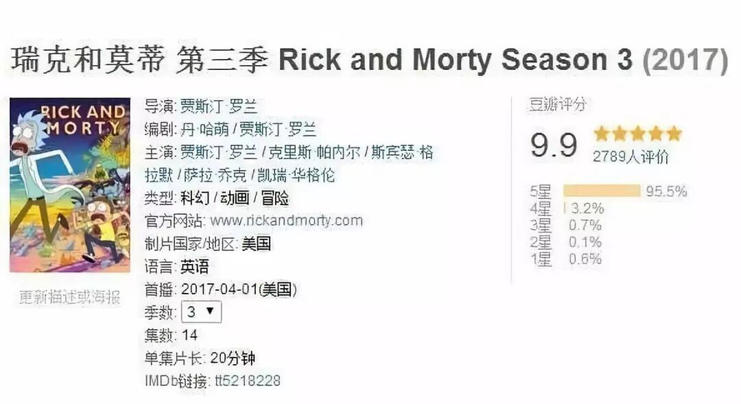 《瑞克和莫蒂》在豆瓣上热度最高的三条短评是:「这部美剧的评分只有9.9,我怀疑有人在黑它。」「我们中间出了没打五星的叛徒。」「我认为能不能看懂本剧,可以作为择偶标准了。」