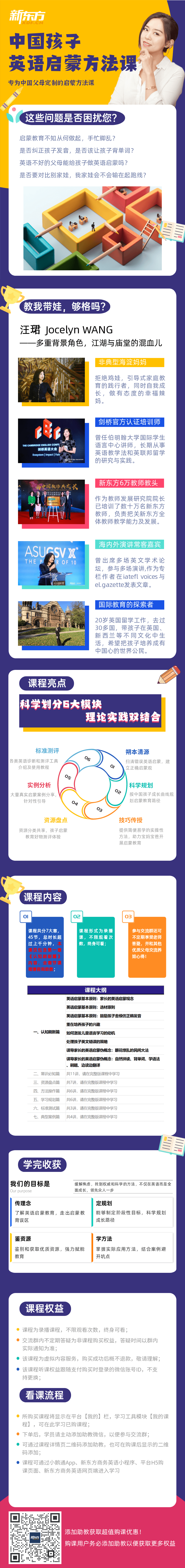 Learning English, page 3其次,寓教于乐特别的重要。所以,我们要尽可能选择有趣的材料,最好是关于真善美的童话、寓言等,不仅让孩子学习英文知识,也让孩子建立正确的价值观,养成良好的品格。同时,我们选取材料也要循序渐进、要有一定的梯度,在刚刚开始学习的时候选择的材料不宜过难。英语启蒙资源浩如烟海,怎样选取真正适合孩子的语料?怎样建立科学的启蒙学习计划?如何科学评估孩子的英语水平和学习习惯,建立适合他的启蒙学习体系?我想这些问题可能困惑着每一个家长。那么,你肯定需要这门课——