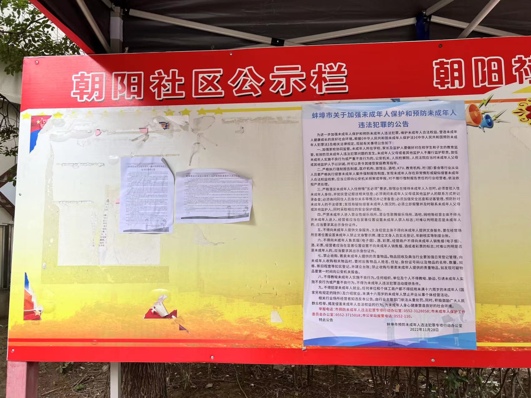 朝阳社区工作人员在小区显著位置张贴《蚌埠市关于加强未成年人保护和预防未成年人违法犯罪的公告》,利用电子显示屏播放未成年人保护方面的宣传标语,并在辖区KTV、网吧、电竞酒店等场所进行宣传。同时,朝阳社区通过网格微信群向未成年人家长及监护人推送预防未成年人犯罪的视频等法律知识,引导他们树立科学教育理念,为孩子的健康成长保驾护航。