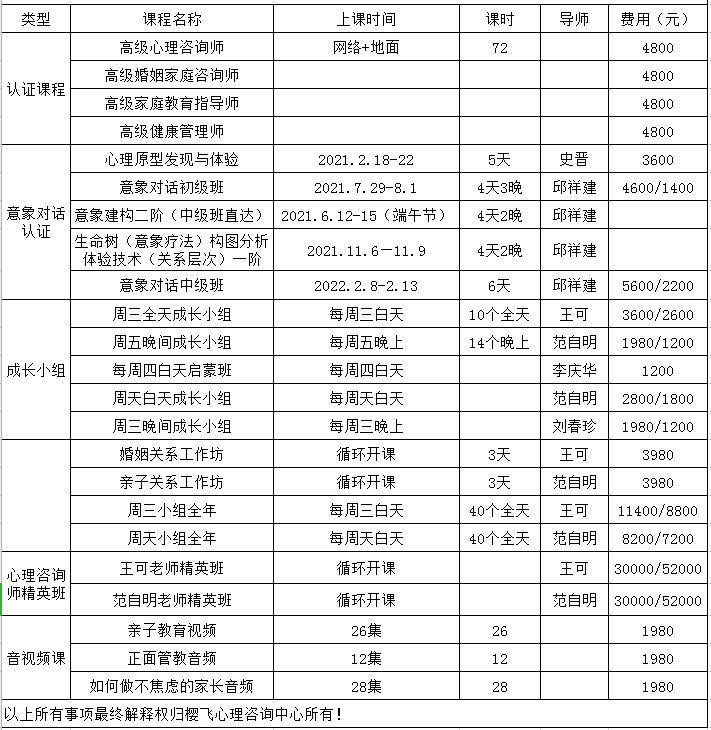 点击下方链接查看课程简介【樱飞心理】史晋|心理原型的发现与意象体验2021.2.18-2.22幸福婚姻工作坊和亲子关系工作坊寻找爱的自由——樱飞成长小组招生!高级心理咨询师开始报名学习了!樱飞“心灵之旅”成长小组火热招生中!樱飞“心灵之旅”成长小组招生中!