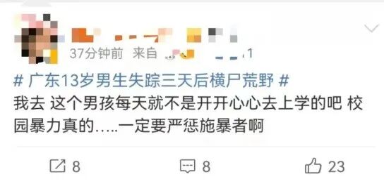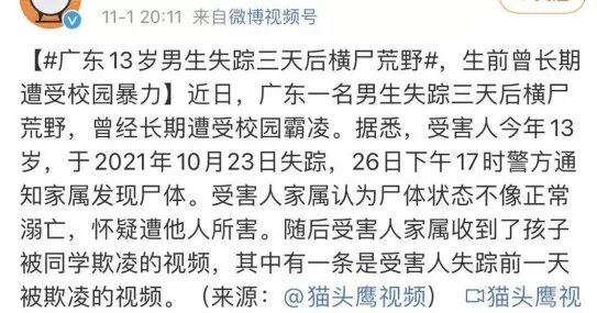 #广东13岁男生失踪三天后横尸荒野#,生前曾长期遭受校园暴力。