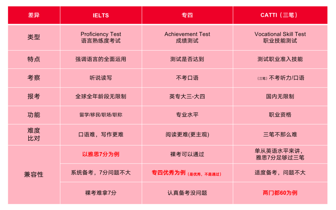 专四专八 / CATTI三笔 / 雅思考试难度对比来了!
