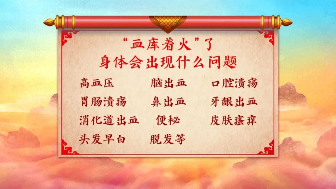 我们今天要讲的第二种人体“血库”容易出现的问题,就是“血库着火”,也就是肝火旺和肝阳亢,它们同样也与很多种中老年人害怕的疾病和健康问题有着密切的联系。杨主任告诉我们,“血库着火”的人群也有个比较常见的症状--身热口渴,这种身热口渴有什么样的特点呢?针对“血库着火”导致的多种问题,杨老师给大家分享了临床常用的经验方凉血解毒方。除此之外,她还给大家带来了自己日常生活中常用的凉血代茶饮凉血解毒饮,里面又有什么呢?