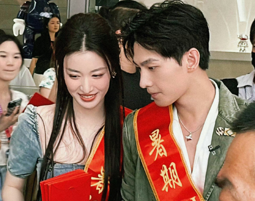尤其身上挂着红色布条时,两人靠在一起走动,就像一对新人在接受大家的祝福,画面不要太养眼。
