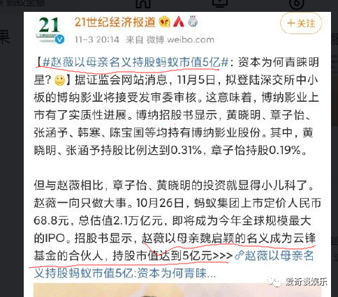 七、2020年 蚂蚁金服上市,赵薇母亲入股5亿。不知道是不是赵薇母亲,这个报道应该不会错吧?