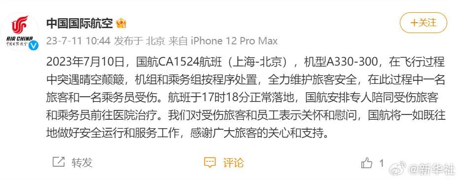 ●7月10日,国航CA1524航班(上海-北京)在飞行过程中突遇晴空颠簸,国航回应↓↓↓