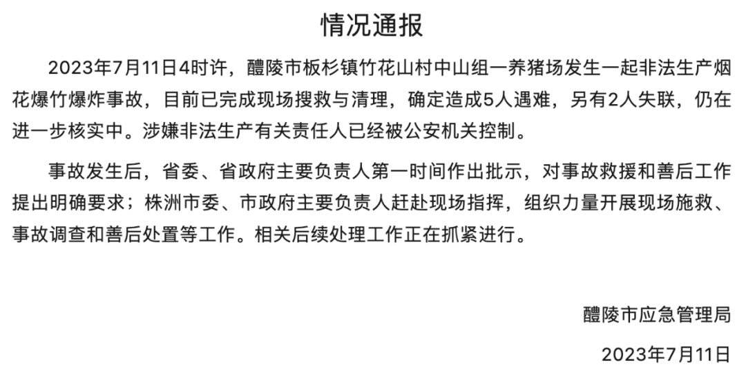 国内●7月11日,湖南株洲醴陵一养猪场发生一起非法生产烟花爆竹爆炸事故,致5人遇难,2人失联。当地发布情况通报↓↓↓