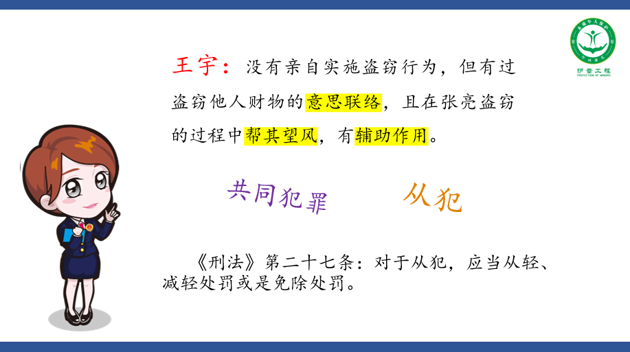 本案中,王宇没有亲自实施盗窃行为,但是张亮与王宇有过盗窃他人财物的意思联络,并且在张亮盗窃的过程中帮其望风,对张亮盗窃有辅助作用,二人应认定为共同犯罪,共同对犯罪的结果承担刑事责任,只是王宇的行为会依法认定为从犯,按照我国《刑法》第二十七条:对于从犯,应当从轻、减轻处罚或是免除处罚。