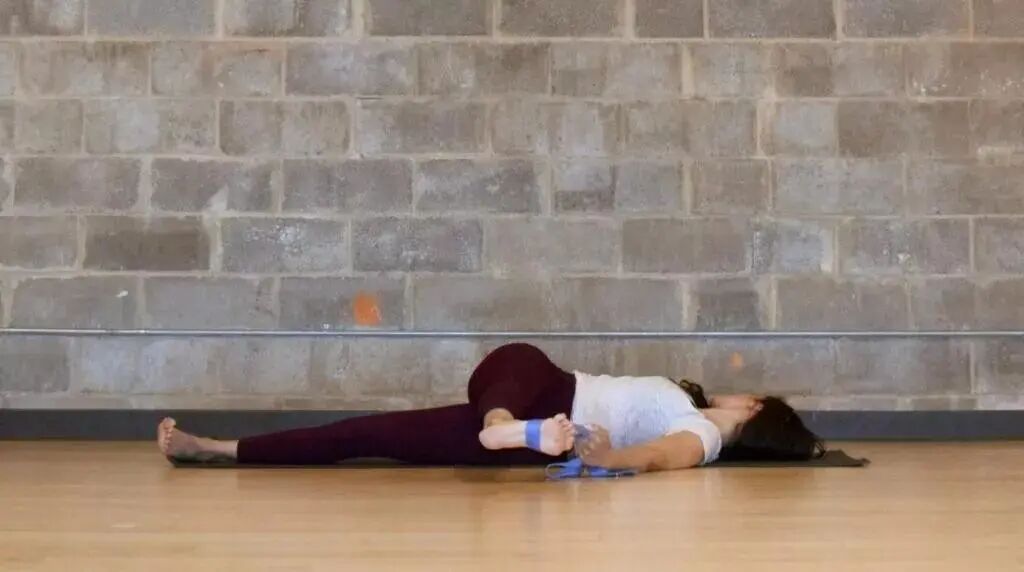 体式分解:仰卧入式,单腿伸直紧贴地面,脚掌回勾,同侧手臂自然放在头部上方,然后抬高另一条腿向上和地面垂直,脚尖回勾,左手用带子牵引拉伸。