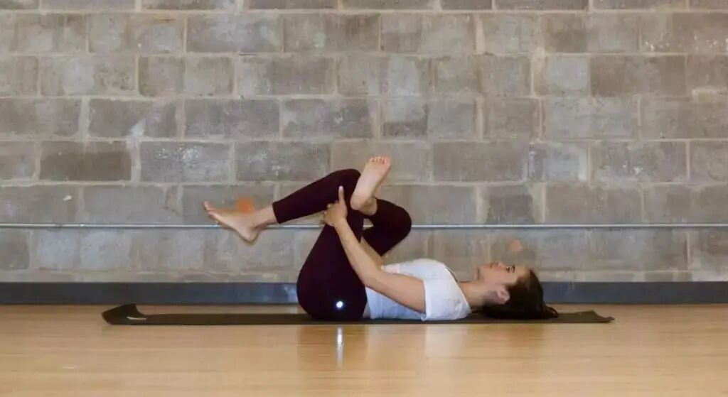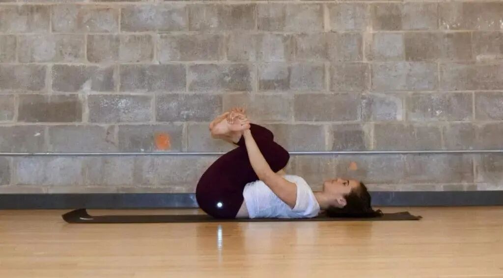 体式分解:仰卧进入,右脚放在左大腿上,脚趾回勾,左脚离开垫子,双手十指交叉抱住左腿胫骨( 小腿骨),呼气时,膝盖拉向胸部,保持5-8次深呼吸。