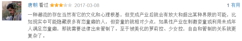 “一种潮流的存在当然有它的文化和心理根基,但变成产业后就会有放大和超出某种界限的可能,比如现实中可能隐藏很多有恋童癖的人,但娈童的就相对少点,如果性产业在刺激娈童或利用未成年人满足恋童癖,那就需要法律出来管制了。至于被美化的萝莉控、少女控,自由和管制的关系就更复杂了。”