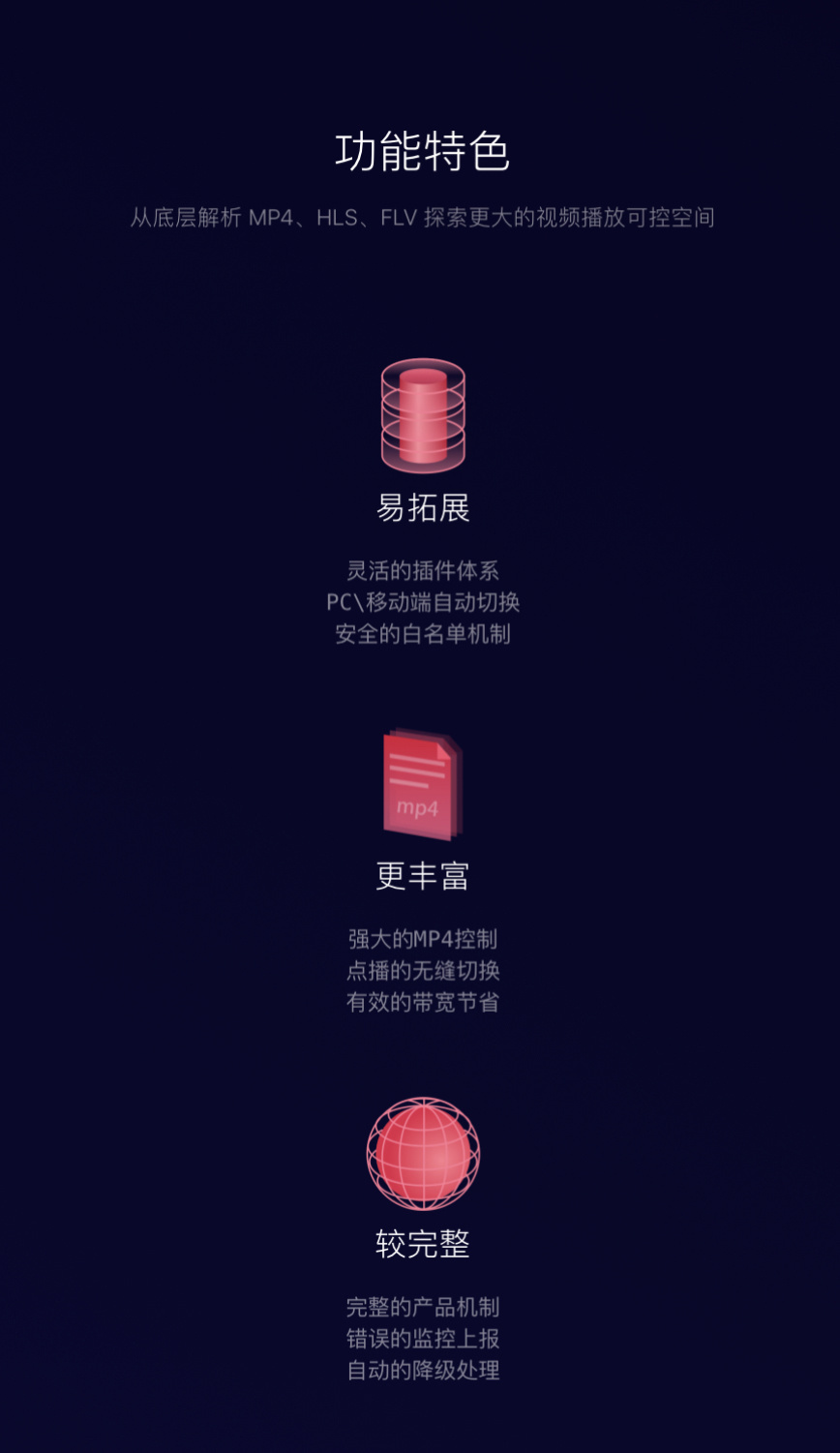 “易扩展”,该播放器具有“灵活的插件体系、PC 移动端自动切换、安全的白名单机制”;