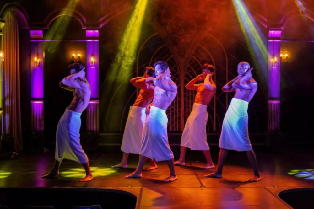 表演开始,第一位男演员穿着浴袍登场,舞台一侧,有一个被设计成浴室的区域,他走过去“洗澡”,身材在一块朦胧的幕布后若隐若现。