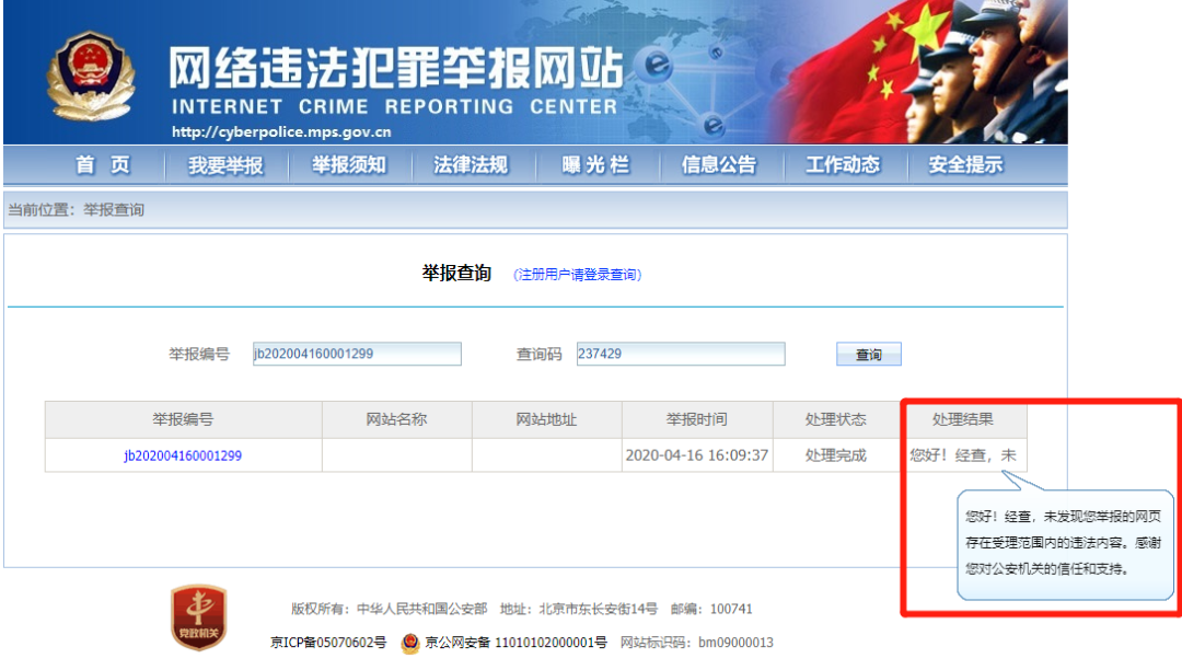 目前,网站显示已处理完成。处理结果为:“您好!经查,未发现您举报的网页存在受理范围内的违法内容。”