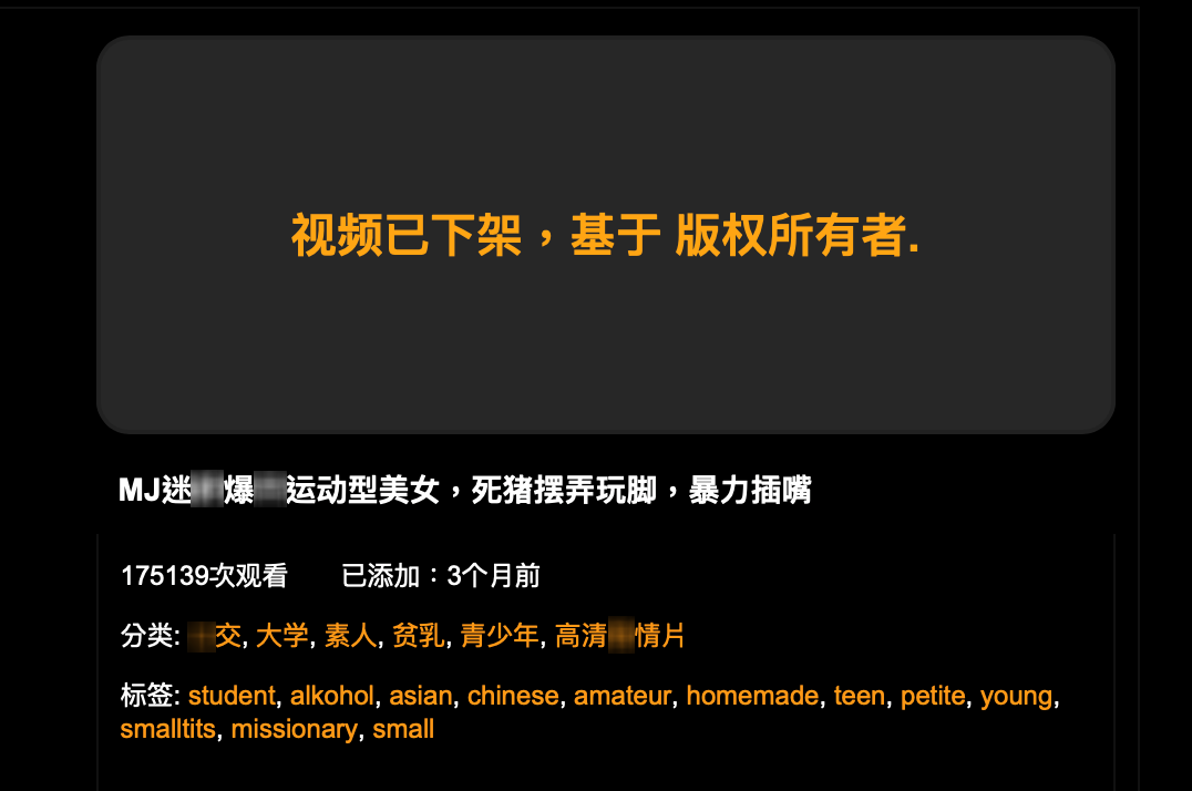 但“国产”视频中,我找不到任何关于这些女孩的信息。她们在哪儿?她们多少岁了?她们……还活着吗? 其他的一些中文关键词中同样藏污纳垢: 迷奸关键词条中,有不省人事的少女被强暴,女生的脸在镜头前暴露无疑,而男生手持录影设备,除了生殖器,几乎没有暴露任何身体部位;轮奸关键词条中,有乳房尚未发育的女孩,被几个男人,轮番蹂躏…… “真实强推,绝不是演的。”