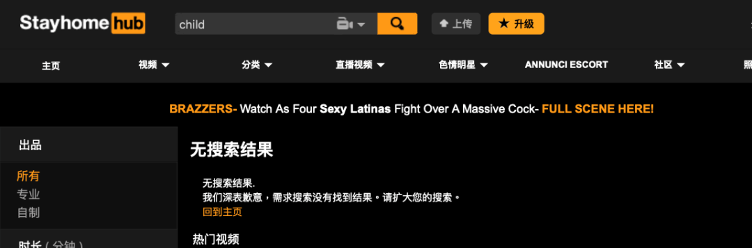 “合法”存在的色情网站非法录制的色情制品 在搜索栏键入Underage(未成年)或者Child(小孩),Pornhub显示没有搜索结果;