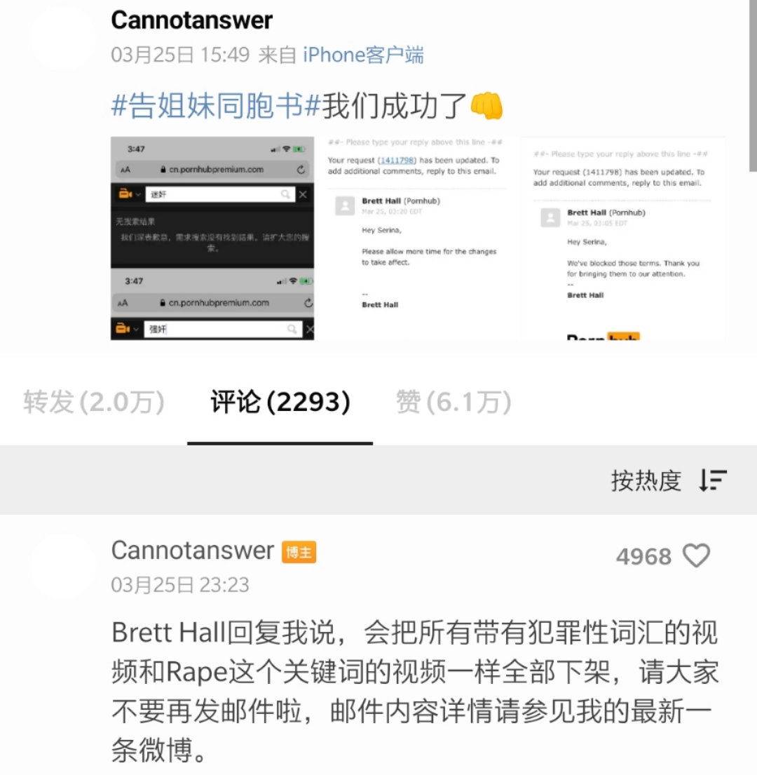 Pornhub,是最主流的色情网站之一,曾被誉为“有社会责任感的互联网公司”,它在疫情期间将logo改成了stayhomehub(“待在家”网),还提供了免费会员。本质上,Pornhub 并不能避免非自愿、未成年等绝对不合法的色情制品被上传。 截至发稿前,在微博@Cannotanswer等网友的努力下,Pornhub给出回复,屏蔽了强奸、迷奸、轮奸等中文关键词,相关视频也已经下线。