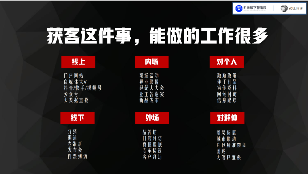 例如你听说哪个媒体别人做了有效,哪个优惠政策别人做了有成交,你会马上去模仿,但是却并未形成线上线下成系统的获客策略。
