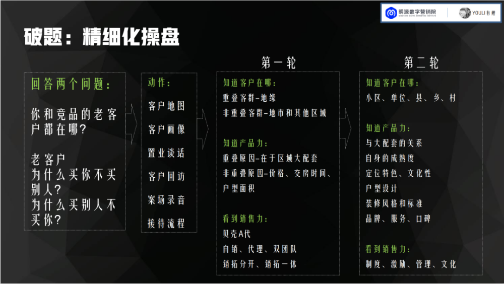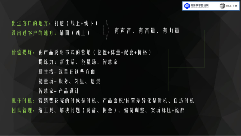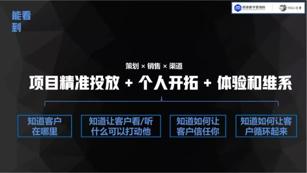 项目精准投放指的是线上和线下投放;个人开拓指的是渠道团队、销售团队、分销团队;体验和维系指的是老带新、老业主维护圈层营销。