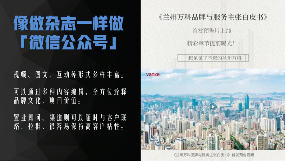 我给大家右边贴了一张图,这是去年兰州万科的一个白皮书,你觉得这个白皮书适合放在抖音上吗?不适合,它适合放在小红书上吗?也不适合。但是它唯一适合的是在自己的公众号去跟客户去讲我做了哪些产品,我有多努力,我有多去认真的去实现一个更好生活的产品献给你。
