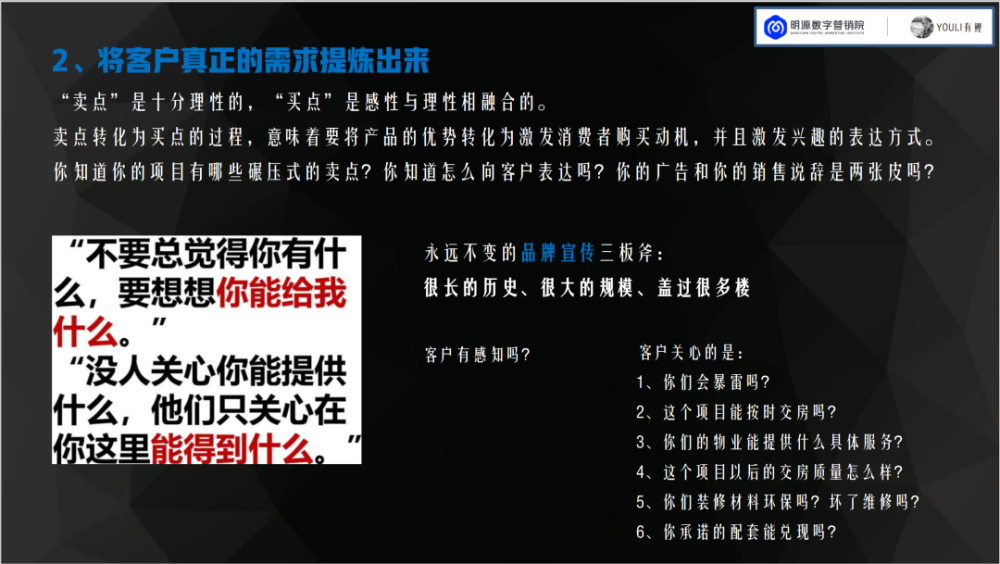 客户真正的需求卖点提炼出来,我们就讲一句话,不要总觉得你有什么,你要想想你能给我什么,这是客户的内心独白,没人关心你能提供什么,他们只关心在你这里能得到什么?