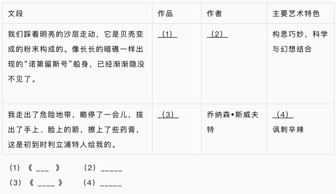 【答案】(1)《海底两万里》(2)凡尔纳(3)《格列佛游记》(4)想象奇异