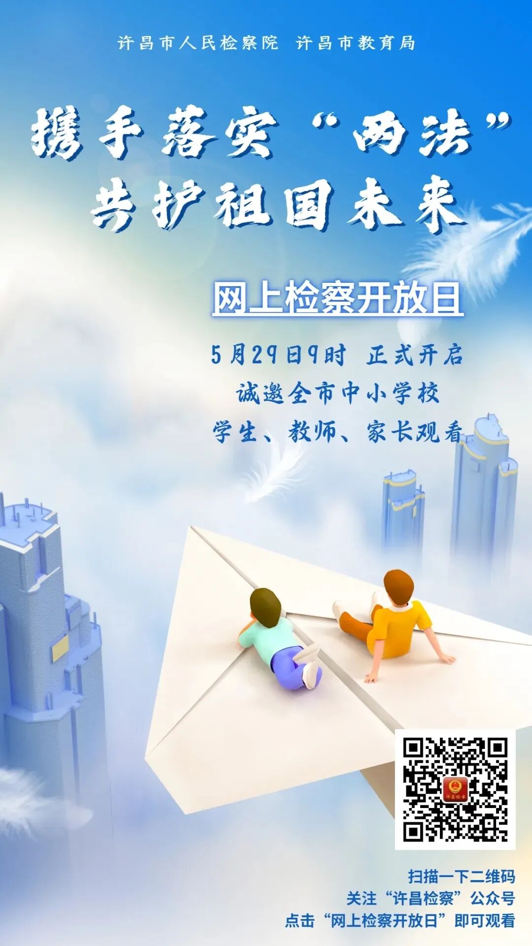 近年来,我国未成年人犯罪和被侵害案件时有发生,原因之一就是一些未成年人法治意识淡薄。于是,值此第72个国际儿童节到来之际,我校联合许昌市人民检察院于5月29日上午九点,为全体同学送来了一份特殊的节日礼物。这份礼物是一场以“携手落实‘两法’,共护祖国未来”为主题的线上检察开放日活动,我校全体师生、家长共同参与了此活动。